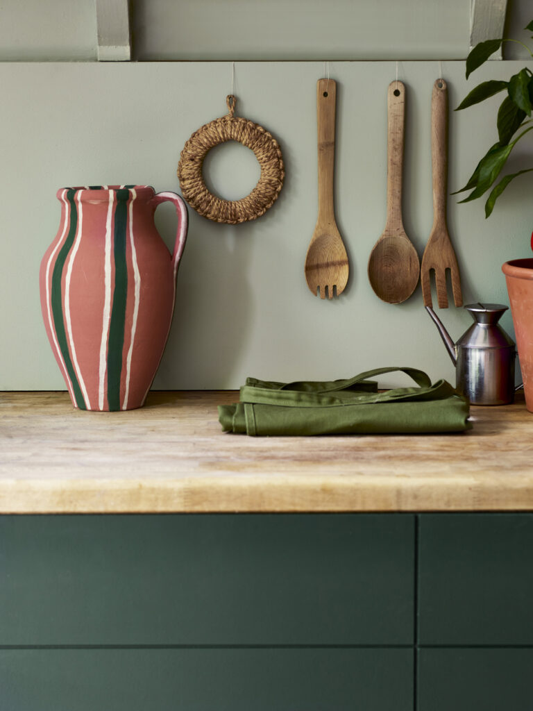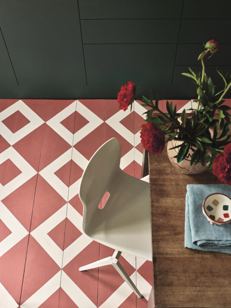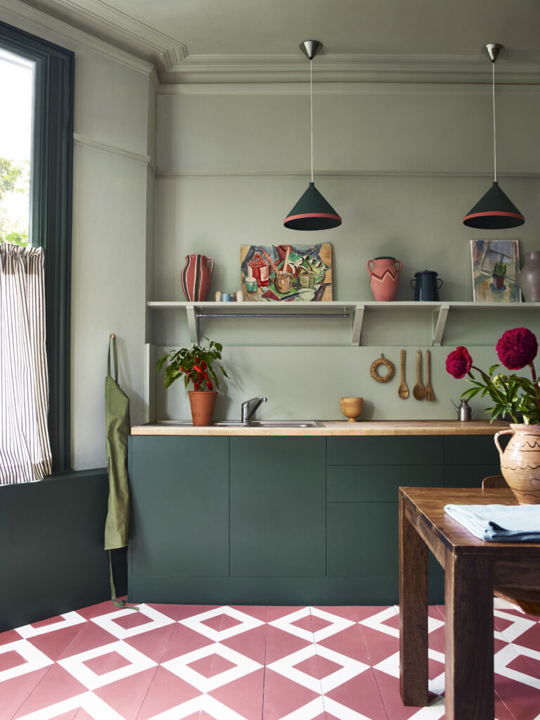 Aici, Satin Paint in nuanta Knightsbridge Green a fost folosita pe dulapuri pentru a crea un contrast. In primul rand cu Wall Paint in nuanta Terre Verte, dar si cu podeaua fabuloasa in model sah, in culorile Scandinavian Pink si Original.