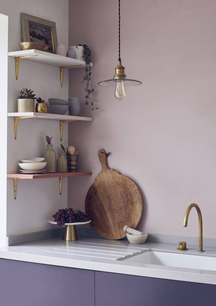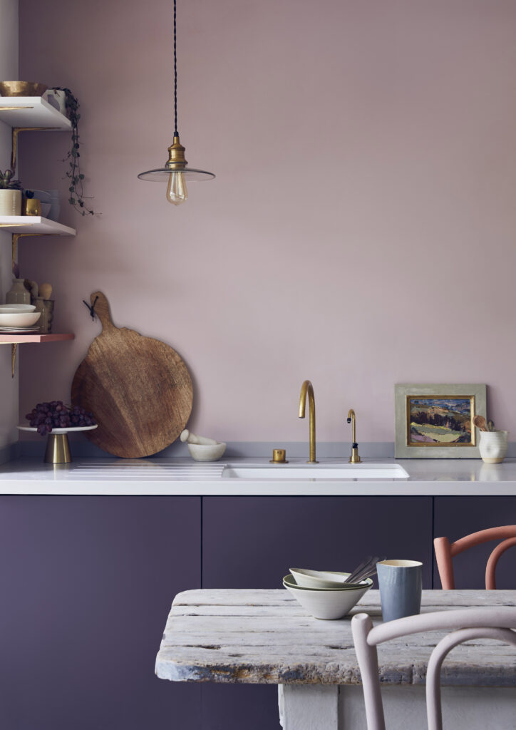 In aceasta bucatarie in nuante de vinete, Chalk Paint in Aubusson Blue a fost amestecata cu Emperor’s Silk pentru a crea nuanta perfecta de mov, in contrast cu peretii roz pictati cu Wall Paint in Antoinette.